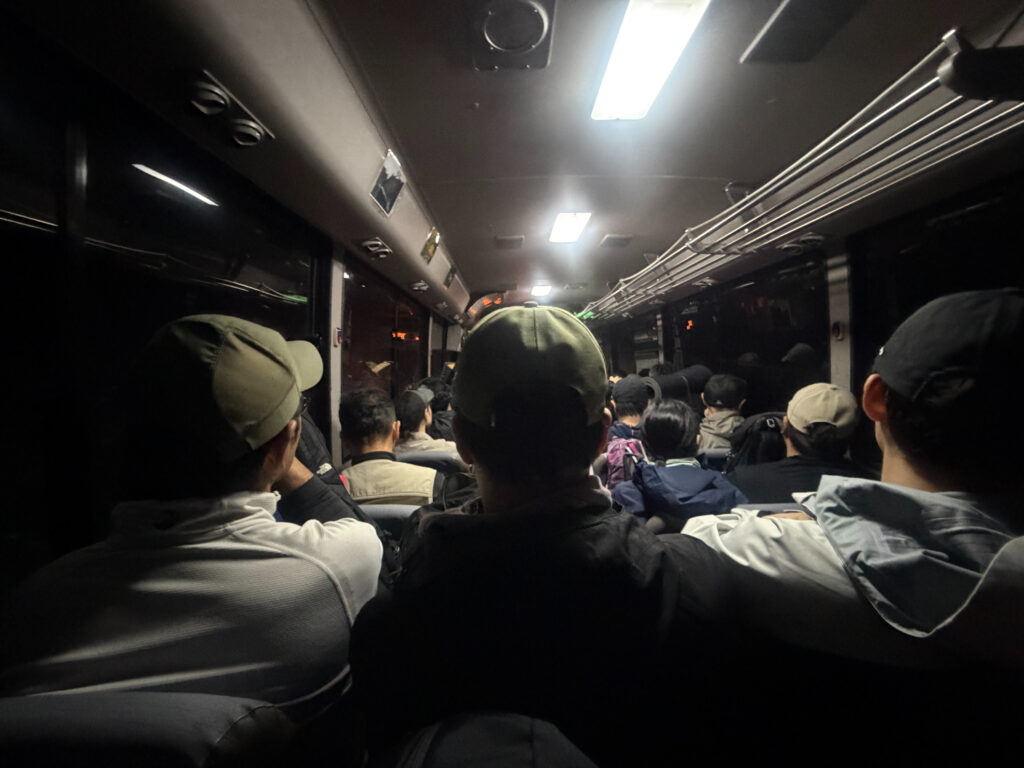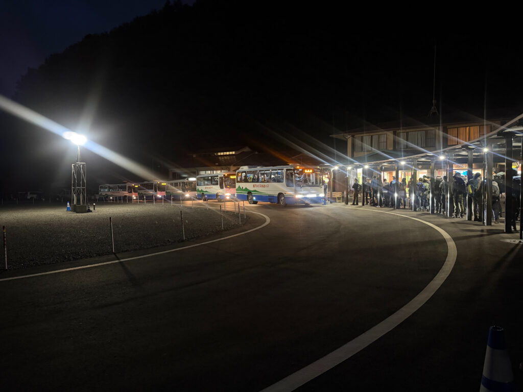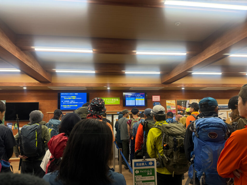 登山者の熱気を感じつつ、まずはバスの乗車券売り場と乗車口に目印を置いて仮眠。