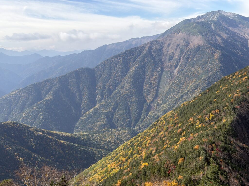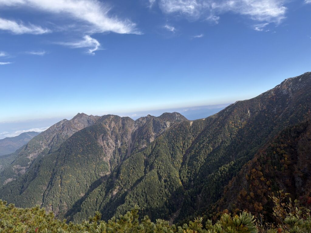 ハイマツ帯の中を抜けると、目の前には緑の稜線と秋色に染まった山肌。