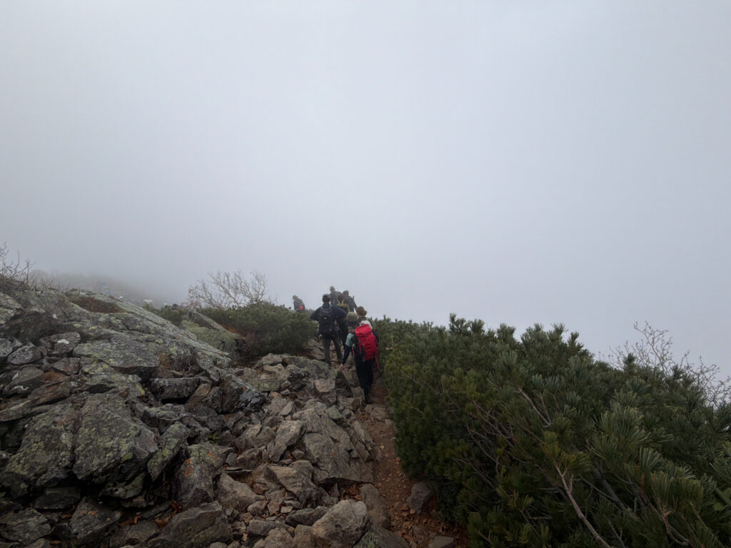 駒津峰が近づくにつれ、ガスが濃くなってきました。このあたりは岩場が続き、勾配も急。少し登るだけで息が切れてしまい、体力のなさを痛感。