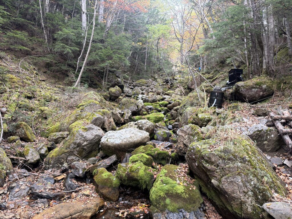 小屋を過ぎると、今回のルートで初めて川沿いの登山道に出ました。岩には苔、澄んだ水の流れる音が心地よく響きます。
