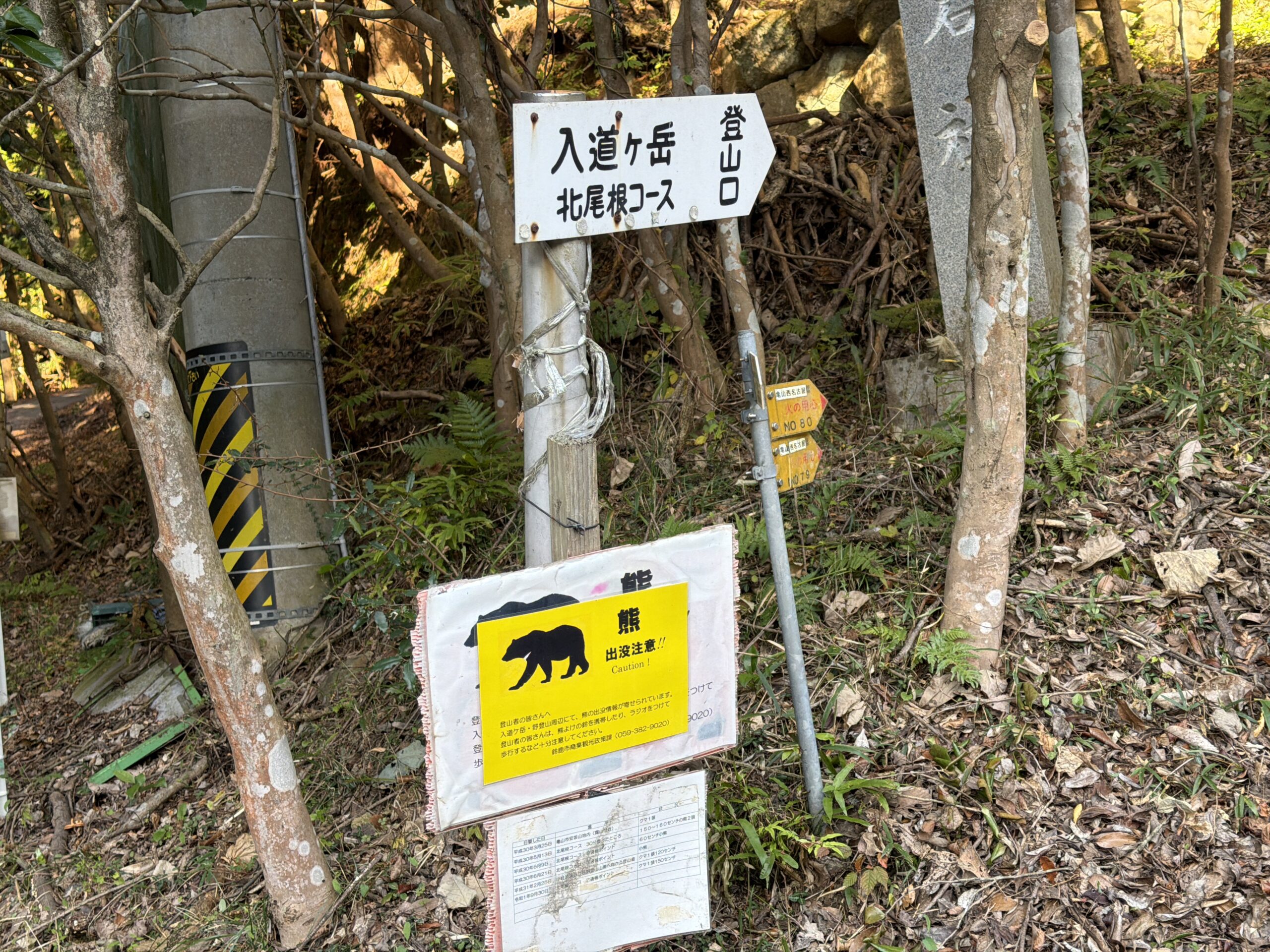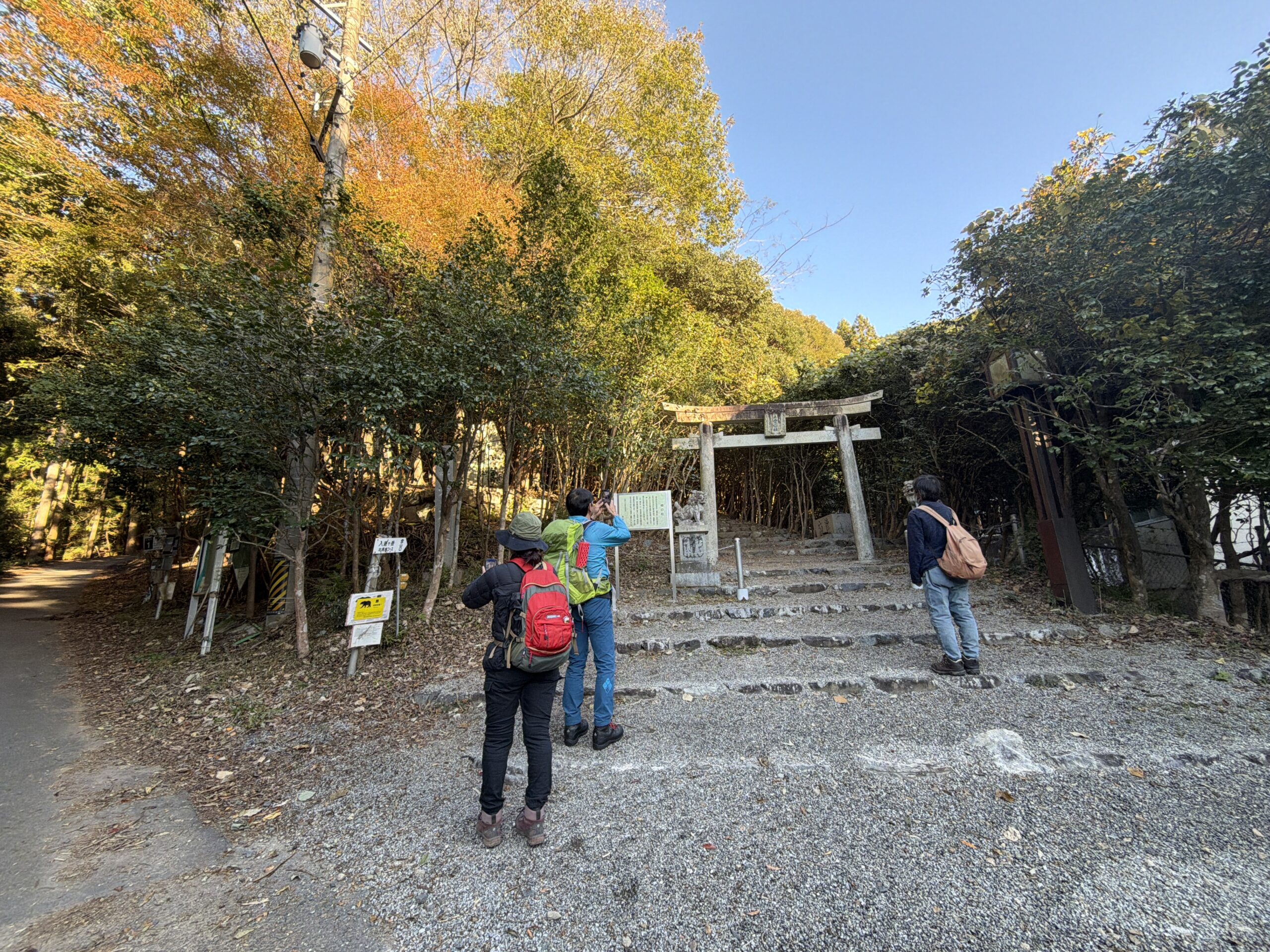 参道を歩いてしばらくすると、登山口に到着。クマ注意の看板が出ていて、ちょっとドキッとする。